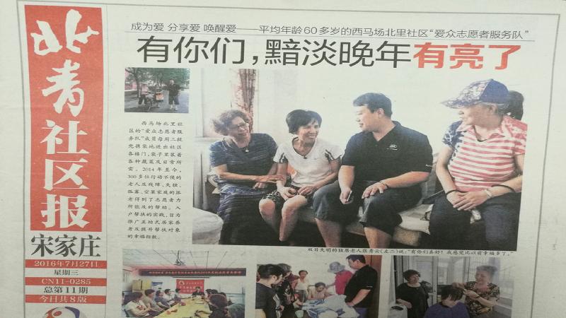 7月27日,《北青社区报》头版报道了西马场北里社区爱众慈孝家园爱老志愿服务队的爱老先进事迹。报道说:2014年至今,西马场北里社区爱众志愿者...