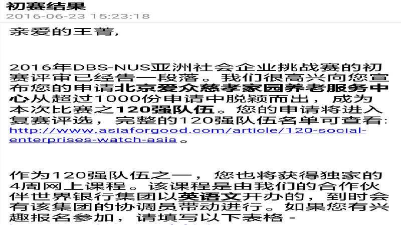 1000多家机构参加2016年DBS-NUS亚洲社会企业挑战赛,经过初赛,北京爱众慈孝家园脱引而出进入120强,其中大陆有19家...