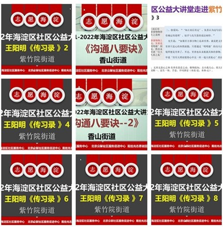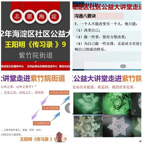海淀社区公益大讲堂为社区志愿者赋能,在紫竹院街道、香山街道开展了王阳明《传习录》系列、《社区社会组织》系列和《沟通》系列等线上课程,同时在八里庄街道及青龙桥街道开展了线下讲座。
