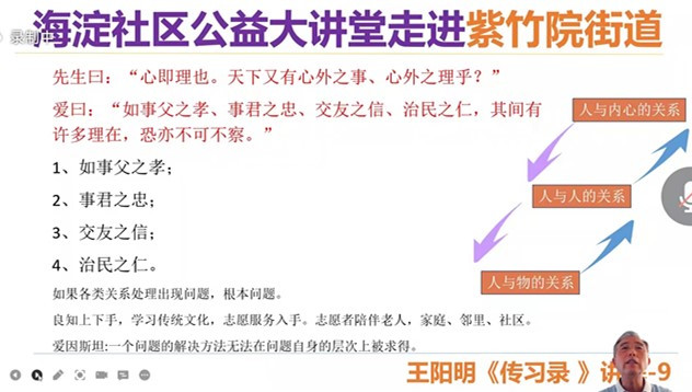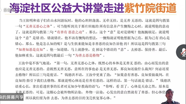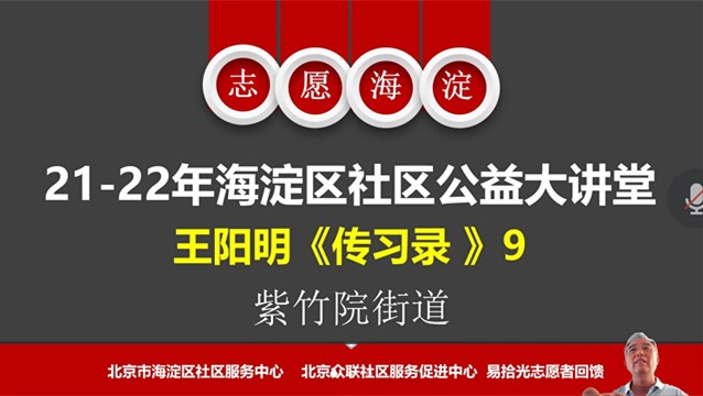 2022年8月8日海淀社区公益大讲堂在紫竹院街道继续通过线上学习的方式,开展了王阳明《传习录》第八讲,讲解了上卷“知止而后有定”的这一部分。