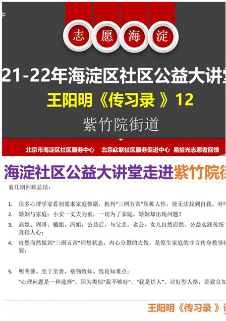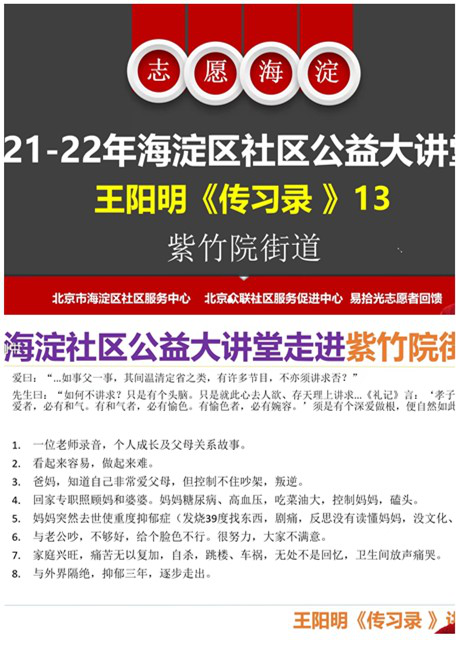 2022年8月23日、26日海淀社区公益大讲堂为紫竹院街道开展了两场王阳明《传习录》讲座。书中讲到“爱曰:“…如事父一事,其间温清定省之类,有许多节目,不亦须讲求否?”先生曰: “如何不讲求?只是有个头脑。只是就此心去人欲、存天理上讲求。”