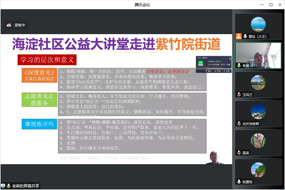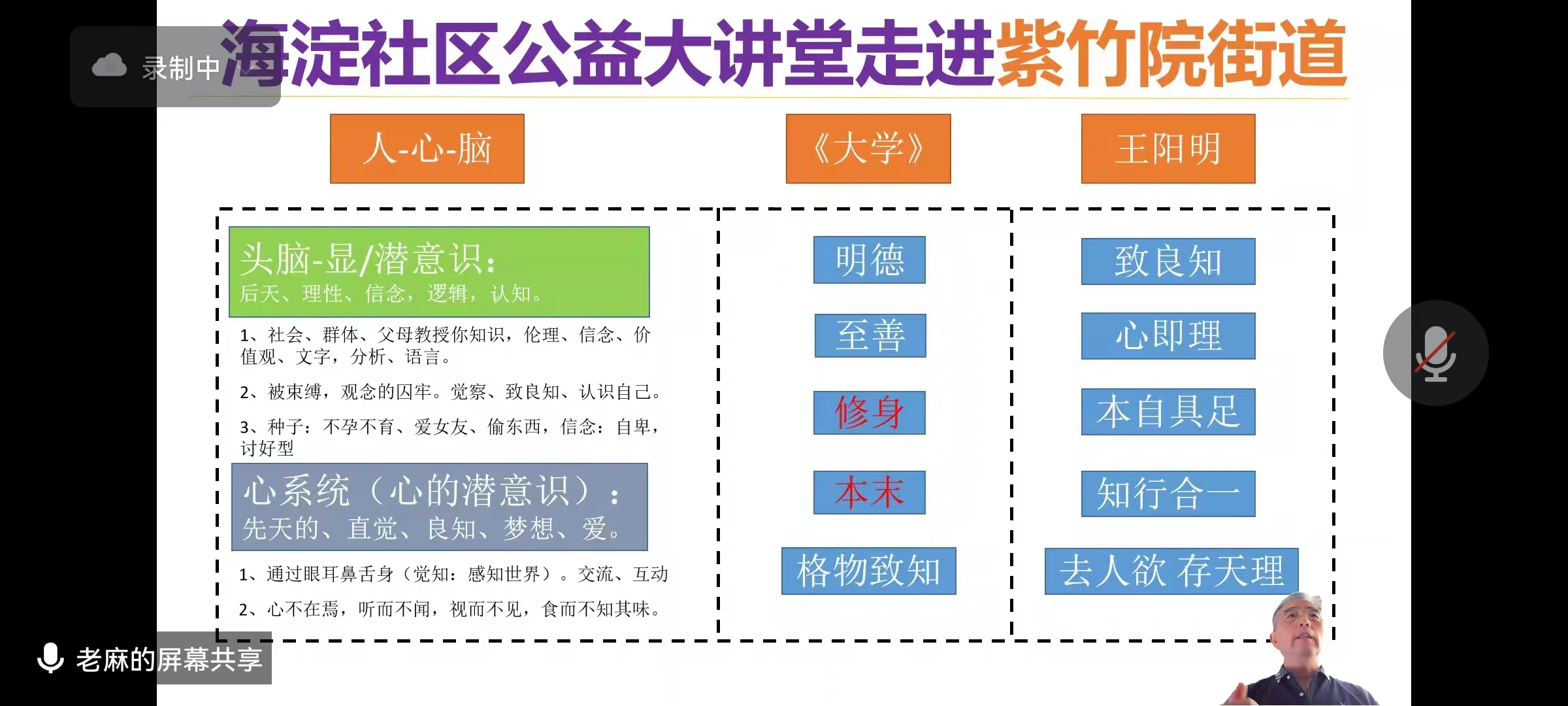2022年的10月27日到11月3日 海淀社区公益大讲堂在紫竹院街道开展了三场线上王阳明《传习录》的学习。