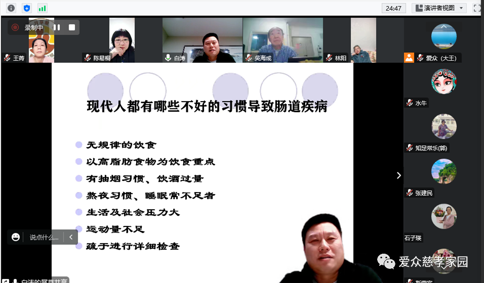 “爱众志愿者之家”在龙潭街道龙北社区陈连英队长、靳蒙宾队长的带领下,持续开展健身锻炼、社区交流会、读书会及健康讲座系列活动。读书会继续学习《不怨人》一书的“找好处,认不是”章节,当我们以修身为本,学会不怨人,不生气,找好处,就更容易处理好各种关系,走得更长远。周五健康课堂由健康管理师白涛老师给大家讲解了有关肠道健康,如何提高免疫力及调节肠道的有关知识。