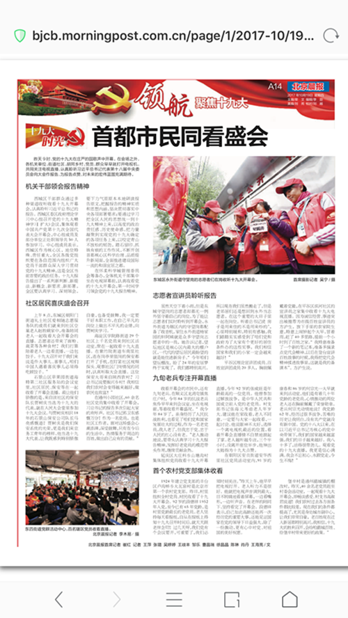 老人睡醒后连忙把志愿者迎进屋,一边招呼着志愿者们,一边说:“我对你可熟悉了”、“我可关心国家大事了”。相视一笑,分坐在大妈身边一起看十九大开幕式。认真地听着习主席的重要讲话,偶尔也聊一些过去的往事,及现在的美好生活。