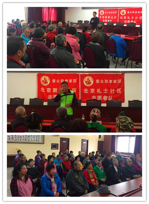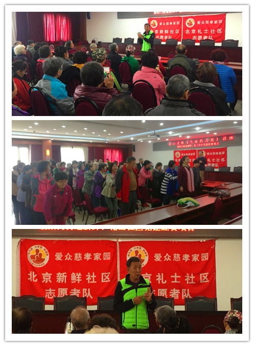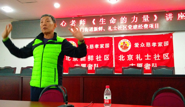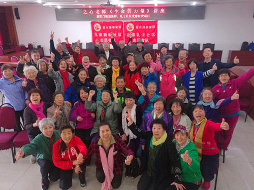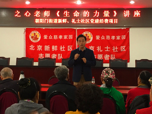 2017年10月28日,北京爱众慈孝家园理事赵之心老师给朝阳门街道新鲜和礼士两社区的居民和志愿者们做了一场《生命的力量》的讲座。赵之心,北京市科学健身专家讲师团秘书长,国家级社会体育指导员,首都体育学院客座教授,全国妇联心系系列活动专家委员会主任委员,中国红十字基金会行者基金行走大使,中国健康教育促进联盟副主席。他多年致力于将科学健身知识传遍给更多的人。