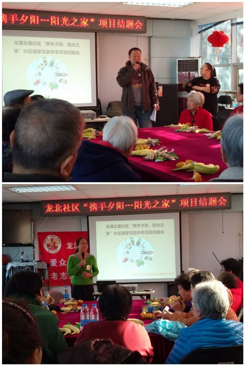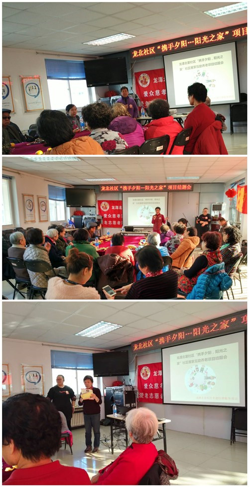 2017年11月22日,龙北社区开展了由党建经费购买的爱老服务项目的结题会,主题为“携手夕阳·阳光之家”。爱众慈孝家园互助式居家养老在龙北社区已运行一年,成果可喜可贺!在这一年中得到了街道、社区以及社会各方面的大力支持和帮助,特此邀请大家欢聚一堂,回顾过去,展望未来。