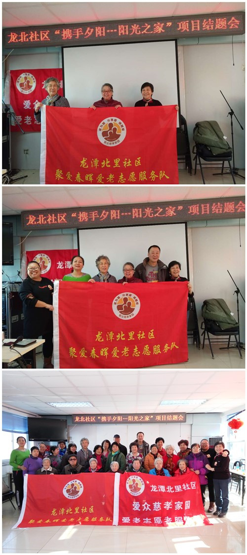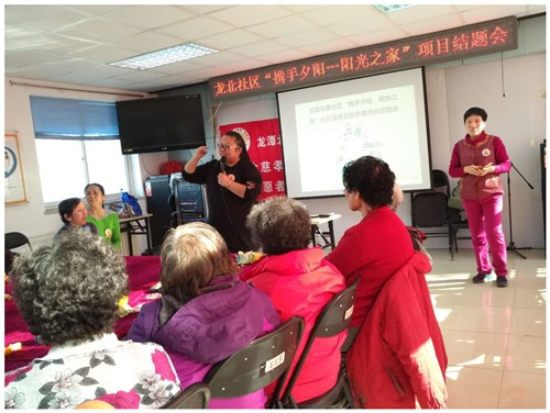 志愿者陈莲英感言:今天在结题会上管委会也发了言,首先感谢社区党委给我们提供了这个平台,我们从去年10月底每天学做赵之心老师花式健步走,身体得到锻炼,大家精神面貌得到改观,并在爱众老师们的分享中使我们开始认识社区居家养老的重要性,我们现在也能为社区老人做些实事;让我们走出家门融入社区,经过入户慰问老人,我们也从中受到了很大的启发;得到老人们的认可,是我们最大的心愿。志愿者队伍从开始的15人发展到现在26人,如今龙潭北里聚爱春辉爱老志願服务队管委会成立了,我们要继续向其它社区的管委会学习,在爱众的关心支持帮助下,大家要团结好,执行志愿服务队章程,履行管委会任职资格及工作职责,在社区党委,志愿者及居民的支持下,一步一步走下去,为龙北社区互助养老工作做出贡献!