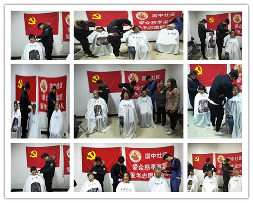 2017年11月22日,国瑞城中区社区再次联手北京爱众慈孝家园、木北造型崇文新世界店,对社区志愿者、社区行动不便、高龄老人等开展了“银剪飞舞,爱心理发”的便民服务。此次活动,有五名爱众慈孝家园志愿者、4名造型师志愿者参加了服务,共理发二十多人次,入两户共理了三人。