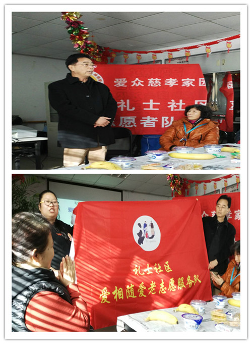 礼士社区于金凤书记做了重要讲话:代表社区党委向北京爱众慈孝家园养老服务中心的各位领导、各位老师们表示衷心的感谢!也向礼士社区爱老分队的志愿者们表示衷心的感谢!