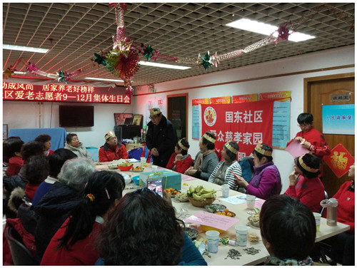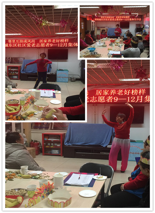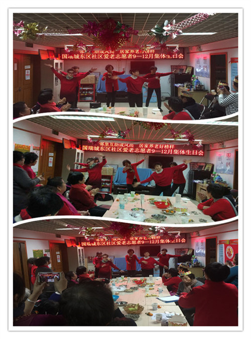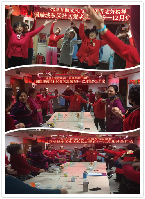 志愿者王忠敏感言:祝贺今天的国东社区集体生日会圆满成功!首先感谢社区领导、麻老师、王菁老师、两位郭老师的大力支持和参与!还有两位队长想的真周到!英丽队长主持的真棒!两位队长给大家买吃的、士华队长细心给大家切蛋糕完后,又给大家收垃圾,全心全意为大家服务!还有咱们的方祝英妹妹,给大家端茶!国东姐妹是多才多艺的!姐妹跳的舞真棒!尤其是王黎明大姐跳的舞真棒!最后祝愿国东社区的志愿者们红红火火的迎接二零一八年元旦的到来。