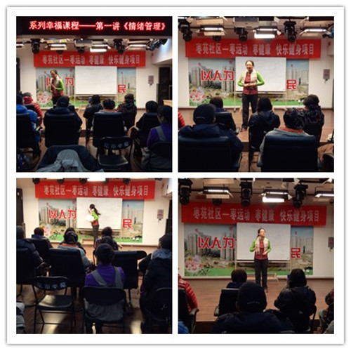 2017年12月11日枣苑社区“枣运动 枣健康”开展了系列幸福课程---第一讲《情绪管理》,爱众慈孝家园王菁老师带领大家如何管理情绪,做情绪的主人,不做情绪的奴隶,良好的情绪可以让自己处于良好的状态。
