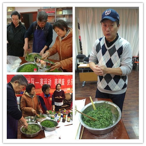 大家早早的就把准备好的包饺子的所有材料拿到了社区活动室;在家剁好了的菜;和好了的面;调好的肉馅------开工吧!场面热火朝天又井然有序,在大家的愉快聊天、相互切磋做饺子的经验当中,各种样式的饺子终于包好了!