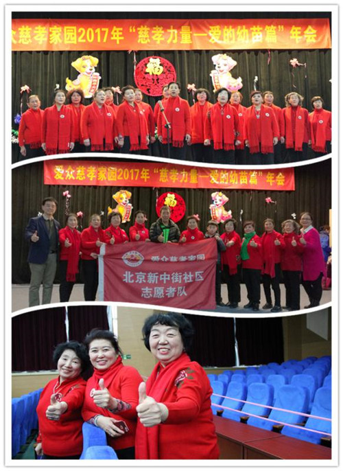 志愿者徐源钧感言:2018年1月18日下午,我们爱众慈孝家园的志愿者参加了新春年会,在大家的掌声中主持人王菁老师上场,我们看到了王菁老师的风彩,感到很温暖。之后在热烈的掌声中节目开始,在众多社区的节目中我们看到的是精彩、认真、热闹、人才辈出,虽然都是年龄大的叔叔阿姨唱的跳的都非常精彩!我也参加了演唱,《团结就是力量》这首歌,我体会深刻,无论是做什么事情,只要大家团结起来拧成一股劲,就能把事情做好,我第一次参加合唱,感到很高兴,我要坚持参加这样的活动,好处多多,心情愉悦。爱众慈孝家园的领导麻国华老师、芝麻开门的赵之心老师前来助阵,给我们志愿者上了一堂生动的课,教我们怎样锻炼身体,怎样跑步、走路,我受益匪浅,麻老师、赵之心老师的讲话,让我们志愿者大开眼界,我们一定按两位老师的思路走,向他们学习,做好志愿者的工作,继续前行,努力!再努力!年会在大家热烈掌声中结束,我们恋恋不舍,期待我们志愿者为爱众慈孝家园所做的一切更上一层楼。志愿者加油!
