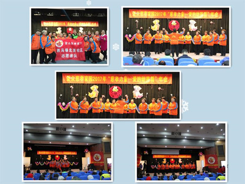 志愿者燕桂滨感言:参加了年会让人感到无比幸福和快乐,爱众慈孝家园是一个温暖的大家庭。老人们通过唱、跳各种表演,抒发着成为爱、分享爱、唤醒爱的宗旨,居家养老成为我们爱众的目标,我们做为一名志愿者,是义不容辞的责任。年会开得太好了,也显示了爱众慈孝家园的各级领导和各社区党委一年来的伟大成就,由衷地感谢你们关怀、照顾我们这些老人,我也七十多岁了,每当做一件为老人服务的事,自己就感到幸福快乐,这就是送人玫瑰,手有余香的道理。2018年来到了,我们社区在党委领导下,居家养老会取得更大成绩,我志愿者工作会更努力做好,让居家养老成风尚,遍地开花结果!