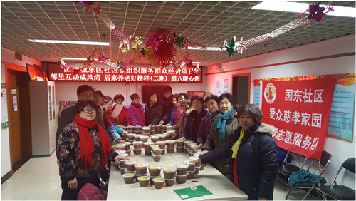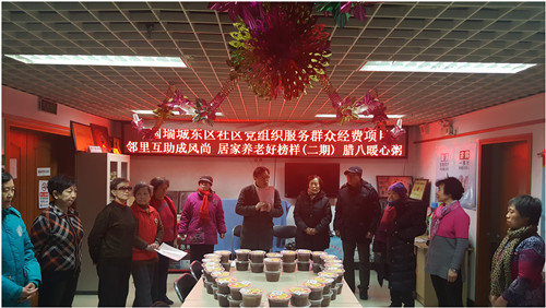 “腊八到,粥飘香”,阴历的腊月初八,按照中国习俗,这天是一定要喝腊八粥的,用以庆祝丰收。2018年1月24日,北京爱众慈孝家园承接的国瑞城东区社区党组织服务群众经费项目“邻里互助成风尚 居家养老好榜样”(二期),开展了“腊八暖心粥 情暖国东人"的活动。
