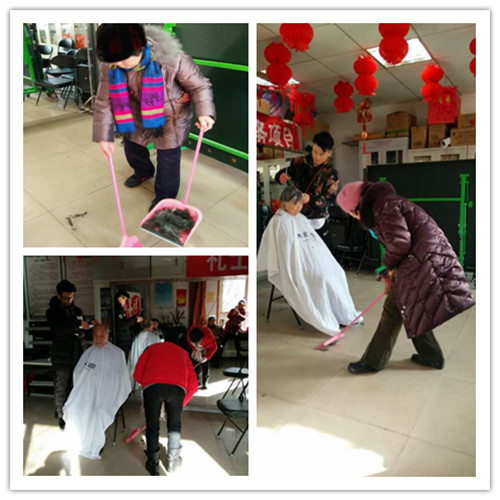 一次次地把地上的头发扫过,保持整洁的同时,以防老人滑倒,志愿者们总是这样细致入微!
