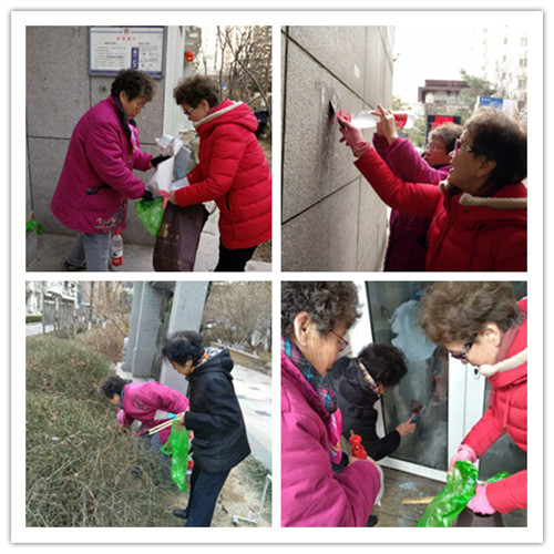 活动时长1小时,其内容包括:清除楼门小广告、小区周边捡拾拉圾等。志愿者们自带工具,如:抹布、水瓶、小铲、夹子——