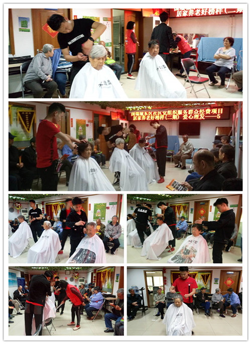 4月28日,国瑞城东区社区志愿者继续针对社区居民开展了“银剪飞舞,爱心理发(7)”活动,特别感谢爱众优秀的合作伙伴之一木北造型(新世界店)的大力支持。参与本次活动有:志愿者理发师8名、大学生3名,入5户,共服务58人次。