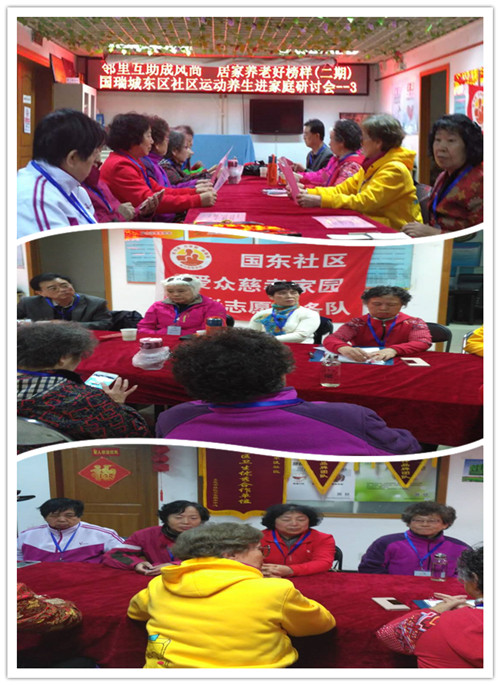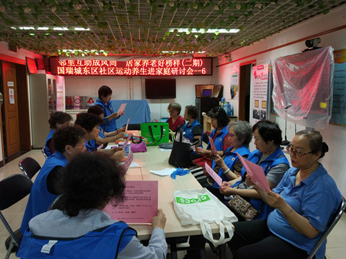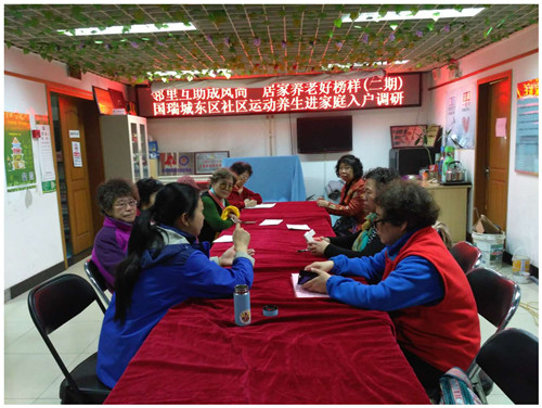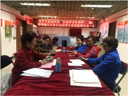 4月8日,运动养生进家庭研讨会-2,社区领导孙哲书记、爱众王菁老师、专员郭砚淑积极参与,认真倾听、献计献策。通过反复研讨,进行小范围的试点探索,以便为更多出行不便的高龄、空巢等老人提供切实有效的健康帮助。