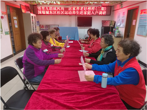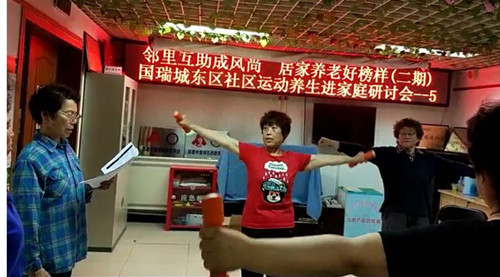 2018年4月-5月份,北京爱众慈孝家园承接国瑞城东区社区党组织服务群众经费项目——邻里互助成风尚 居家养老好榜样(二期)项目,开展了“运动养生进家庭研讨会”。这项活动,全程将接受赵之心老师的指导,使老人们拥有运动养生的理念、并运用科学锻炼的方法,达到提高健康水平的目的。至5月10日,“运动养生进家庭研讨会”共开展6次,其中入户2次,器械培训2次,推选名单1次,敲定名单1次。