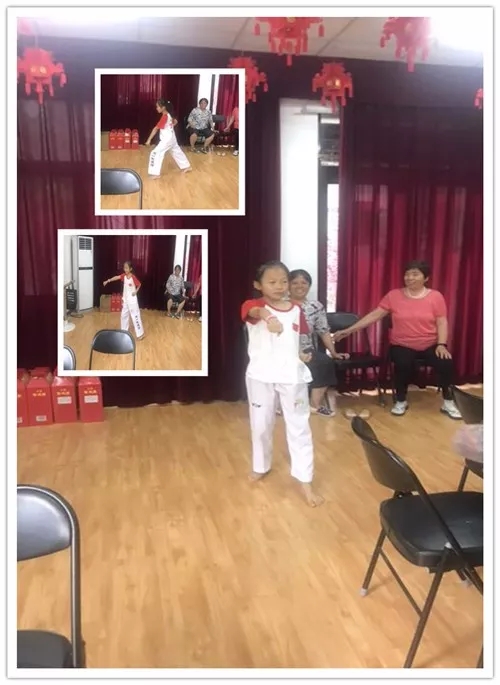 小朋友来助兴,跆拳道表演。老人和小朋友一起分享着幸福和快乐。孩子参与活动,不仅让社区的老人们深深地感受到了家人的祝福,也让孩子们了解和体会到了尊老爱老的中华传统美德的美好情感!