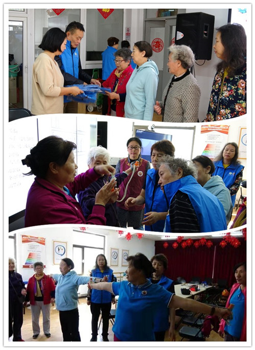 陈德平为新达标的志愿者发放统一服装,蓝马甲是咱共同的标志。随后,又进行了器械养生操培训,志愿者们投入学习。