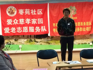 志愿者孔玉红感言:我和周敬泽、张继英三人被大家推选为这一届管委会,非常感谢大家对我们的信任和支持,近10个月以来志愿团队在社区党组领导下、爱众各位老师的引领下,在爱老助老方面做了一些工作、参加了社区的不少活动,看到了小老人去帮助大老人是一件很有益义的活动,从中大家受益了、收获了;每次活动姐妹们都争着参加,互相帮助、认真完成,枣苑姐妹们充满着活力正能量,大家的努力是今后做好邻里互助、孝老爱亲的志愿者服务工作的重要依靠,龙北和国中社区的管委会委员,陈大姐和董大姐分别介绍了她们的很多工作经验,我深受启发和感动,许多做法都值得我们学习。我一定继续尽自己能力为我们的志愿团队姐妹们服务,我们三位管委会成员要团结合作,配合社区各位领导为枣苑社区居家养老尽自己一份力量,我们枣苑这支志愿者团队也一定会更加成熟壮大!