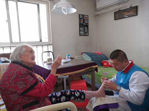 修脚的志愿者端来热水给老人泡脚,一打开随身带的工具箱立刻得到老人们的啧啧赞叹,说:“你们特别专业,特别好!”