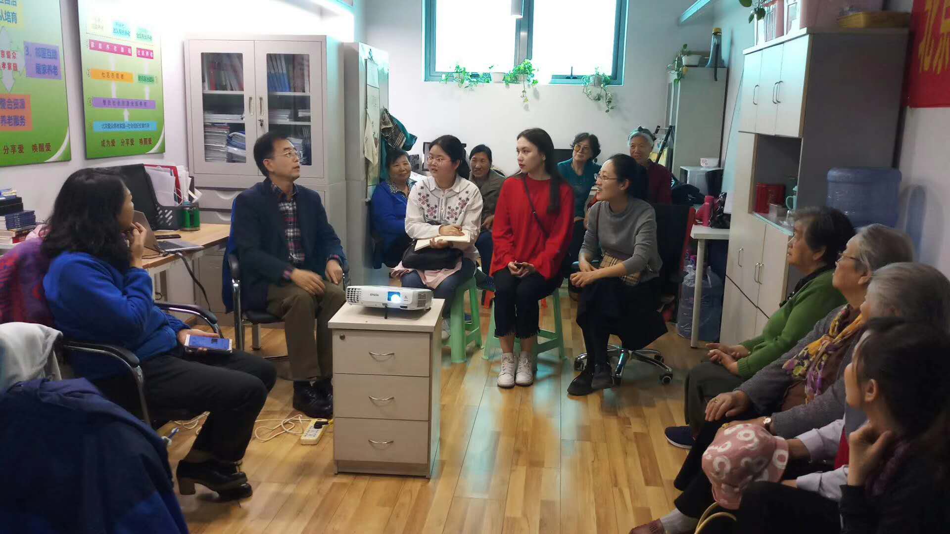 2019年4月23日,北京爱众慈孝家园迎来了中国老年学和老年医学学会副总干事,华北电力大学老龄科学与政策研究中心,刘博士一行约十位老师同学,共同探索互助养老模式。爱众慈孝社区专员高玉萍和陈景芬,国东志愿者赵志红,国中志愿者董淑琴和王建国等都积极参加交流会。特别令人感动的是国中社区三位高龄志愿者88岁孙玉美、80岁吕秀文及77岁的梁琴听到交流会的消息,十分高兴,表示一定要来参加,要表达自己参加互助养老的收获和体验。在交流过程中我们介绍了爱众互助养老模式,刘博士也表达说: 双方对于互助养老的想法很一致,我们一起推动我们的理念想法被政府接受,互助养老是社区居家养老良性可持续发展的必然趋势。交流会进行过程中志愿者们积极发言,谏言献策,她们的状态给刘博士等留下了较为深刻的印象。会后双方表示很渴望进一步开展合作,使更多老人受益。