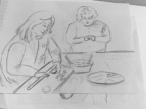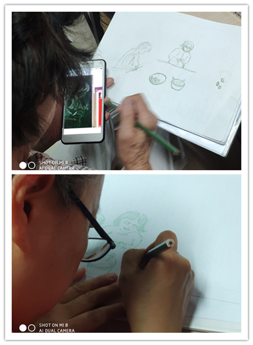 随后大家开始认真地作画,老人们相互鼓励,互相交流,相互帮助,通过认真思考,老人们都绘出了自己满意的作品。