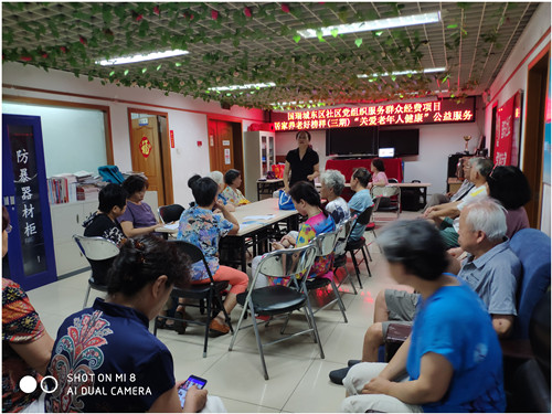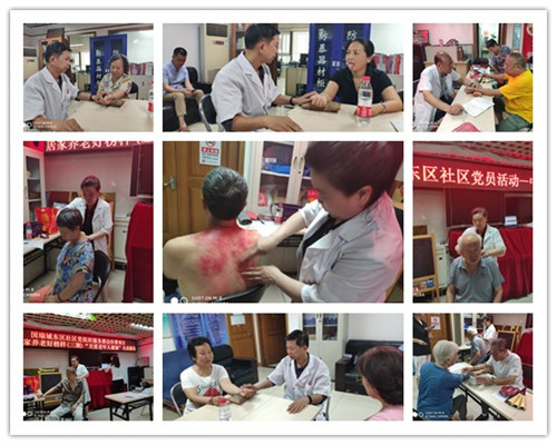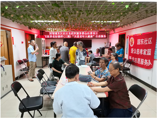 2019年7月15日,北京爱众慈孝家园承接的国瑞城东区党组织服务群众经费项目——“邻里互助成风尚 居家养老好榜样(三期)”,在社区党委、居委会的大力支持下,开展“关爱老年人健康”公益服务。此次义诊活动,方便了社区党员及老人们在家门口看病就医,足不出户就可以享受免费的医疗与服务,提高健康知识水平,增强健康保护意识,携手打造和谐健康社区。参加服务统计:党员人数26人;爱众志愿者10人;服务的医生5人;中医咨询:包括中医把脉、理疗共23人次;按摩、刮痧共10人。