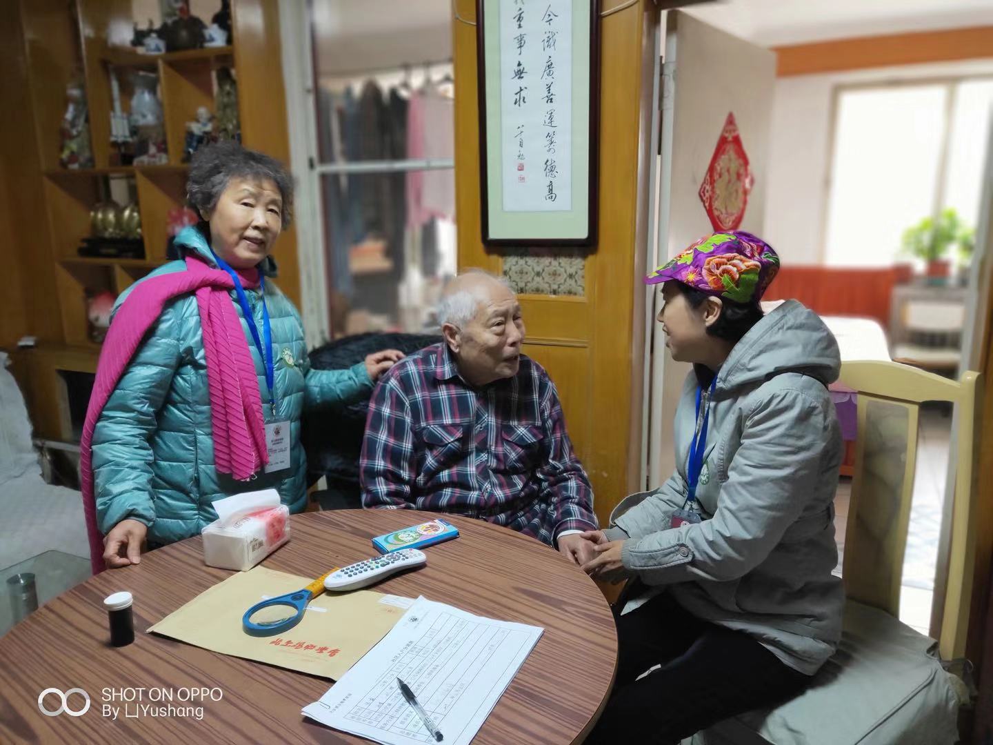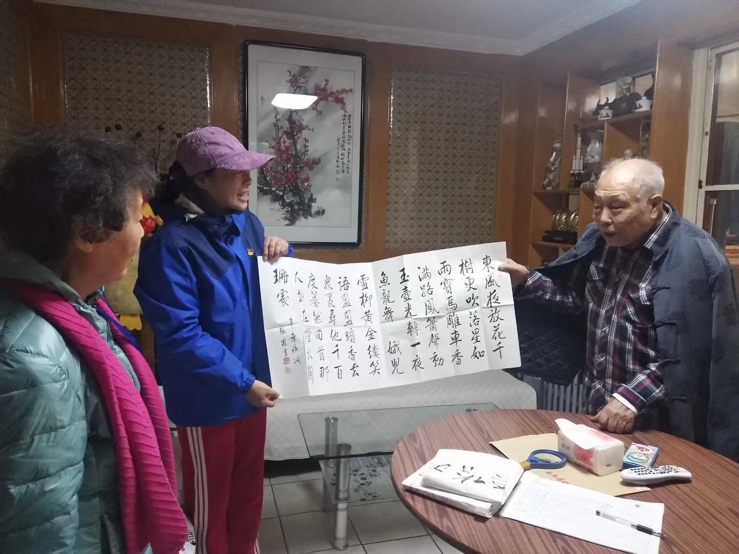 我今天与曹金陵和郑树梅大姐去了两户,第一户由于提前与老人通话沟通了,今天见面老人见到我们就像见到久别的亲人一样热情,让我们以一种完全放松的心情去陪伴老人,倾听老人的诉说,看到老人滔滔不绝的诉说,我们的心里也很高兴,老人很慈祥,虽然身体状况不是很好,但精神状态很好!聊到高兴之处,老人坚持要送我们每人一幅字,为了让老人高兴我们欣然接受了,老人见我们收了他老人家写的字,又说,今后有需要一定要找他,他要为我们社区居家养老出一份力。就是这样一位老人他之所以长寿真的是他有一个好的心态这就是长寿老人的秘诀,给老人点赞。