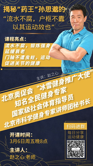 3月6日,主题“揭秘药王孙思邈的流水不腐,户枢不蠹,以其运动故也”,什么是身体上的流水不腐 户枢不蠹?如何抵抗微生物或其他生物的侵蚀?常流的水不发臭,常转的门轴不遭虫蛀,居家隔离长时间不运动容易淤积,有氧运动和关节锻炼会化解淤积,不停的运动中抵抗了微生物或其他生物的侵蚀。
