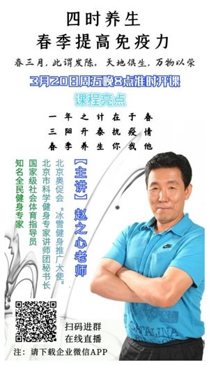 3月20日,主题“四时养生 春季提高免疫力”,阳春三月 此谓发陈 天地俱生 万物以荣,赵老师告诉我们春分开始要连续10天运动出汗,更有利于夏天的出汗排毒,要踏青、啃青。