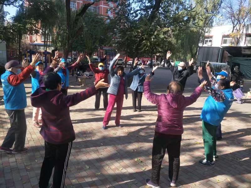 2020年11月2日--3日,在八里庄街道定慧东里社区,教授了赵之心老师的“迎冬奥冰雪健身操”。这两风大,温度较低,已经将健身常态化的一些社区的义工们带着喜悦的心情积极参加本次教操活动。特别值得称赞的是社区蔬菜商兰女士向现场健身的义工们再次赞助了蔬菜,表达对他们的敬意。冰雪健身操是全民健身专家赵之心老师为了迎接2022年北京冬奥会,响应习大大提出的实现3亿人上冰雪运动的目标而特意创编的。经过我们两年多的社区推广,充分证明这套操对提高老年人的腿部力量特别有效,深受老年朋友的喜爱。今年冬天我们会再次面临席卷全球的新冠肺炎的考验,如何应对?通过科学锻炼,提升自身免疫力恐怕是最重要的应对手段。我们也祈愿每一位义工都积极科学锻炼起来,为自己、为家庭、为中国,一起加油!