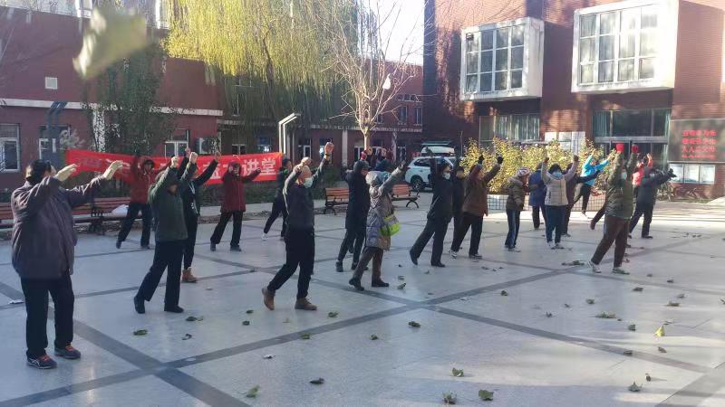 2012年12月3日,在紫竹院街道北外社区教授第二套健身操,北京奥促委“冰雪运动推广大使”、全民健身专家赵之心老师编制的迎冬奥冰雪健身操。尽管北京的天气寒冷,但居民们仍然热情高涨,认真学习。