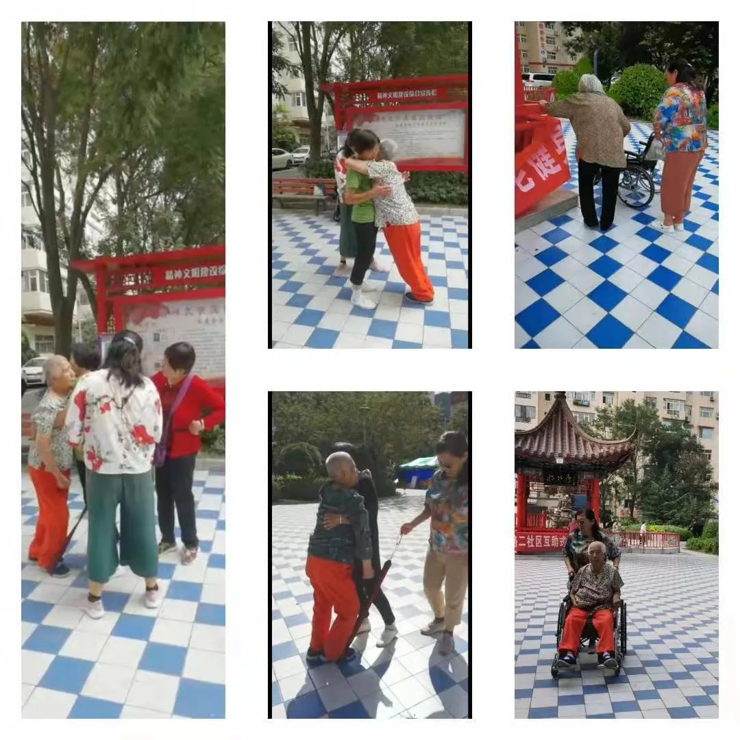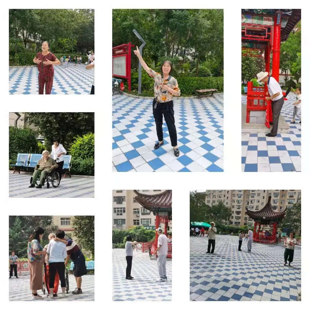 山西爱众慈孝家园的志愿者贾晓飞老师每天骑着电动车带着6岁的女儿和我们一起陪伴大哥大姐们,她的热情和温和的笑容温暖着每一个健身队的成员。最值得敬佩的是她每天和穆大姐搀扶着贾大姐练习走路,贾老师在陪伴的过程中不断地鼓励,不断地加油,高质量的陪伴让贾大姐的右腿能自己抬起来往前走了,同时也让贾大姐有了对健康身体的渴望之心。付出既是得到,贾老师在陪伴大家的过程中也收获到喜悦的心情。韩大姐和贾大姐在练习走路的时候,小区的居民们都很认真的看着她们,惊奇她们每天的变化。