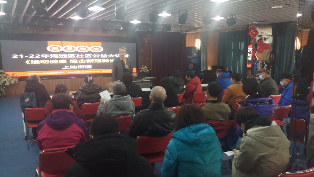 2022年3月1日海淀社区公益大讲堂在上地街道举办了《运动健康管理 阻击新冠肺炎》讲座。众多社区干部及居民骨干都来参与。讲座讲解了针对目前疫情反复,人们如何通过运动锻炼、改善饮食及生活习惯等方法提高免疫力,阻击新冠肺炎。